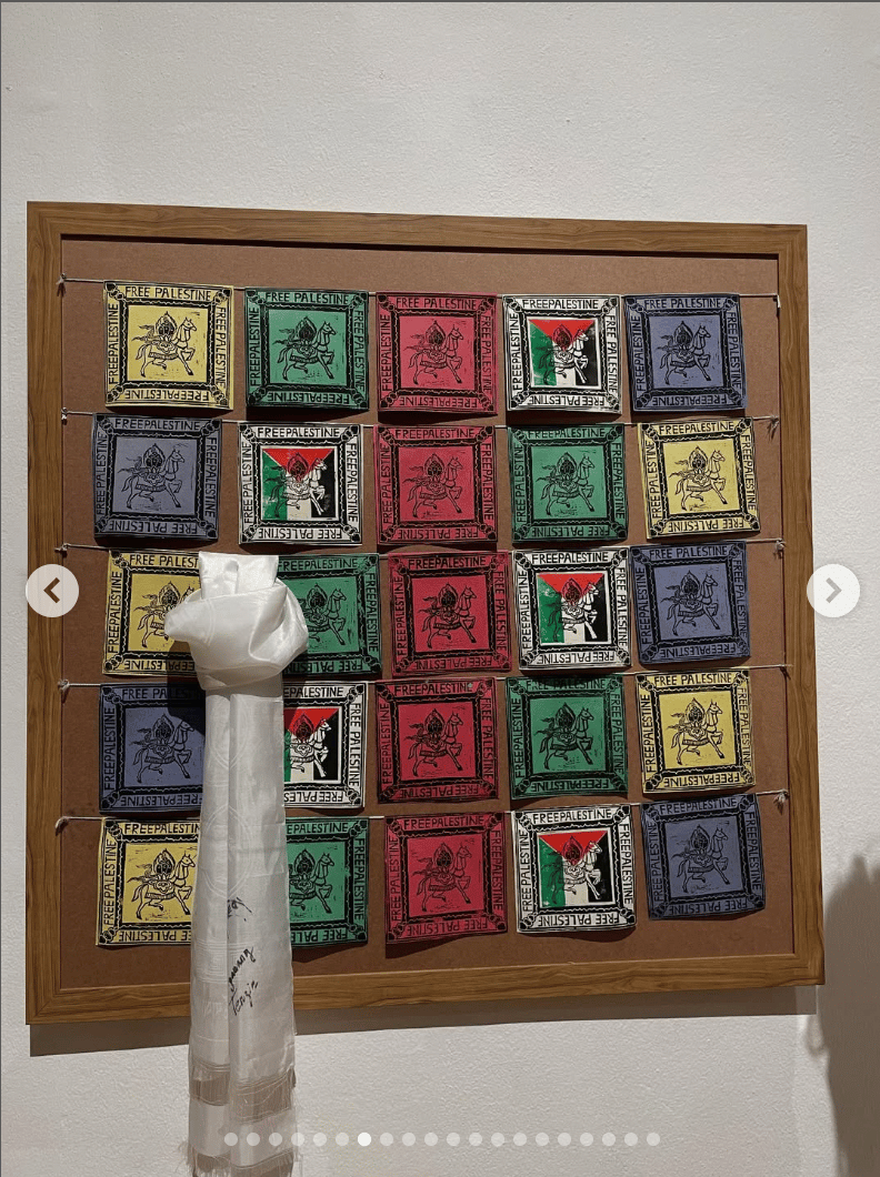 Tibetan prayer flags for Palestine at Doc Tenzin’s installation