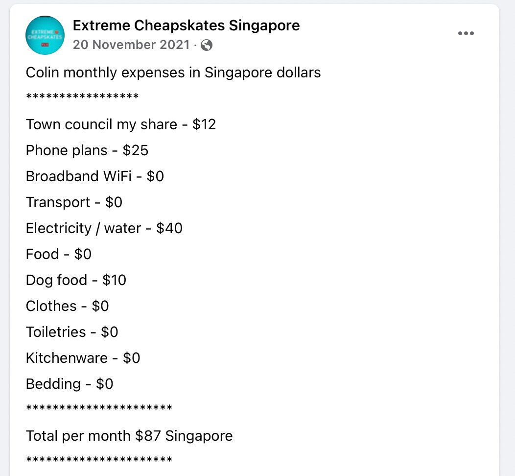 In a November 2021 post, Colin recorded his (extremely low) monthly expenses in Singapore: